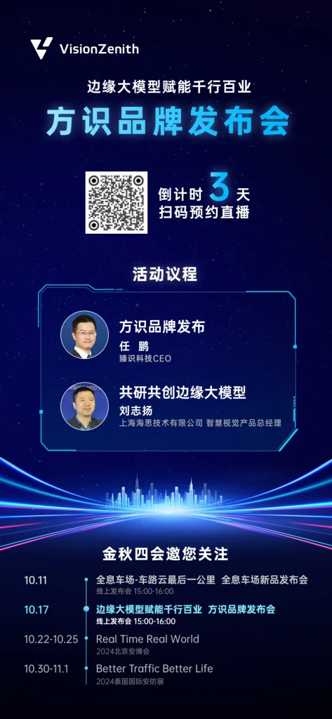 边缘大模型作为赋能场景智慧升级的革新科技,一直备受市场关注。臻识科技无疑已经走在了边缘大模型探索之路的前列。10月17日,臻识将以“边缘大模型赋能千行百业——方识品牌发布会”为主题,揭秘当前的产品成果和实践应用,诚挚邀请您预约直播!